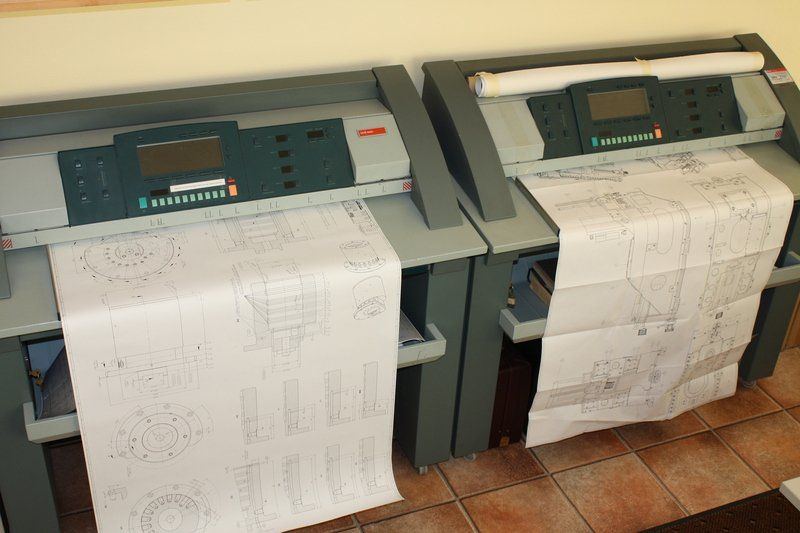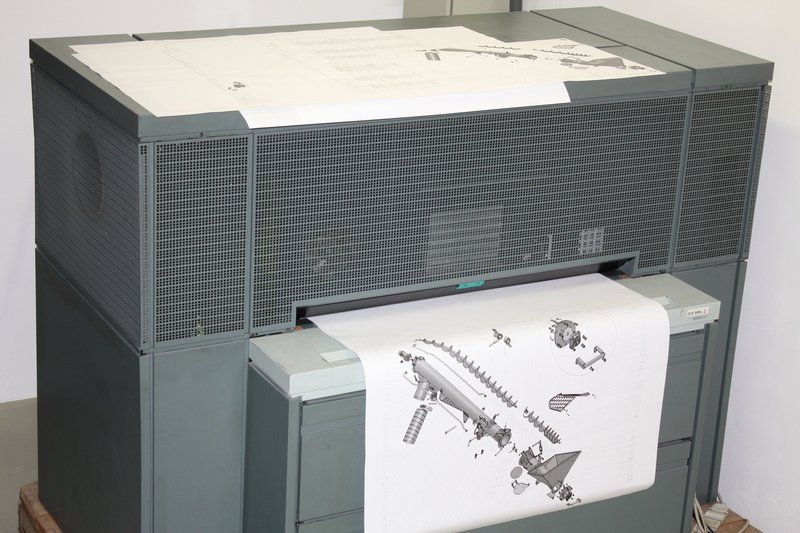 Mittels Digitaldrucker / -scanner können auch großformatige (Bau-) Zeichnungen eingelesen (gescannt) und mit maschinenspezifschischen Daten ergänzt und wieder "zu Papier" gebracht werden.